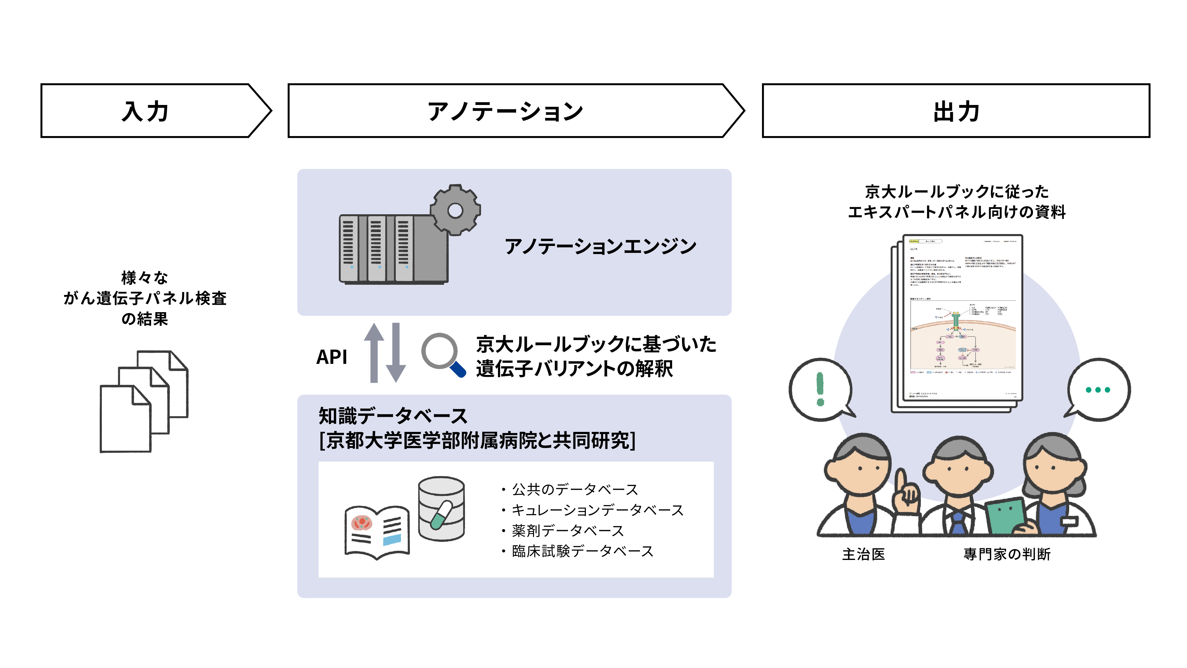 がんの特徴をゲノムレベルで解析し、個々の患者さんに合った診断や治療を行う「がんゲノム医療」が世界的に広がりを見せています。国内では2019年6月より「がんゲノムプロファイリング検査」が保険適用となり、2025年7月時点で10万人以上の方が検査を受けています。この「がんプロファイリング検査」には複数の専門医などがあつまり、検出された遺伝子バリアントに対する臨床的意義付けや治療方針を議論する「エキスパートパネル」が導入されました。一方で、がんゲノム医療中核拠点病院等連絡会議 ( https://www.ncc.go.jp/jp/c_cat/jitsumushya/090/index.html ) などで指摘されているように、遺伝子バリアントの解釈、薬剤検索、臨床試験の検討には専門的な知識や判断が必要なため、エキスパートパネルの負担が大きいという声が報告されています。